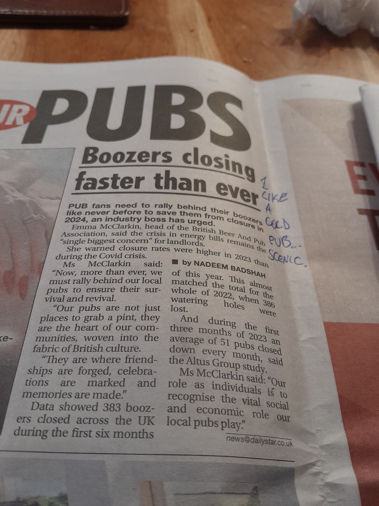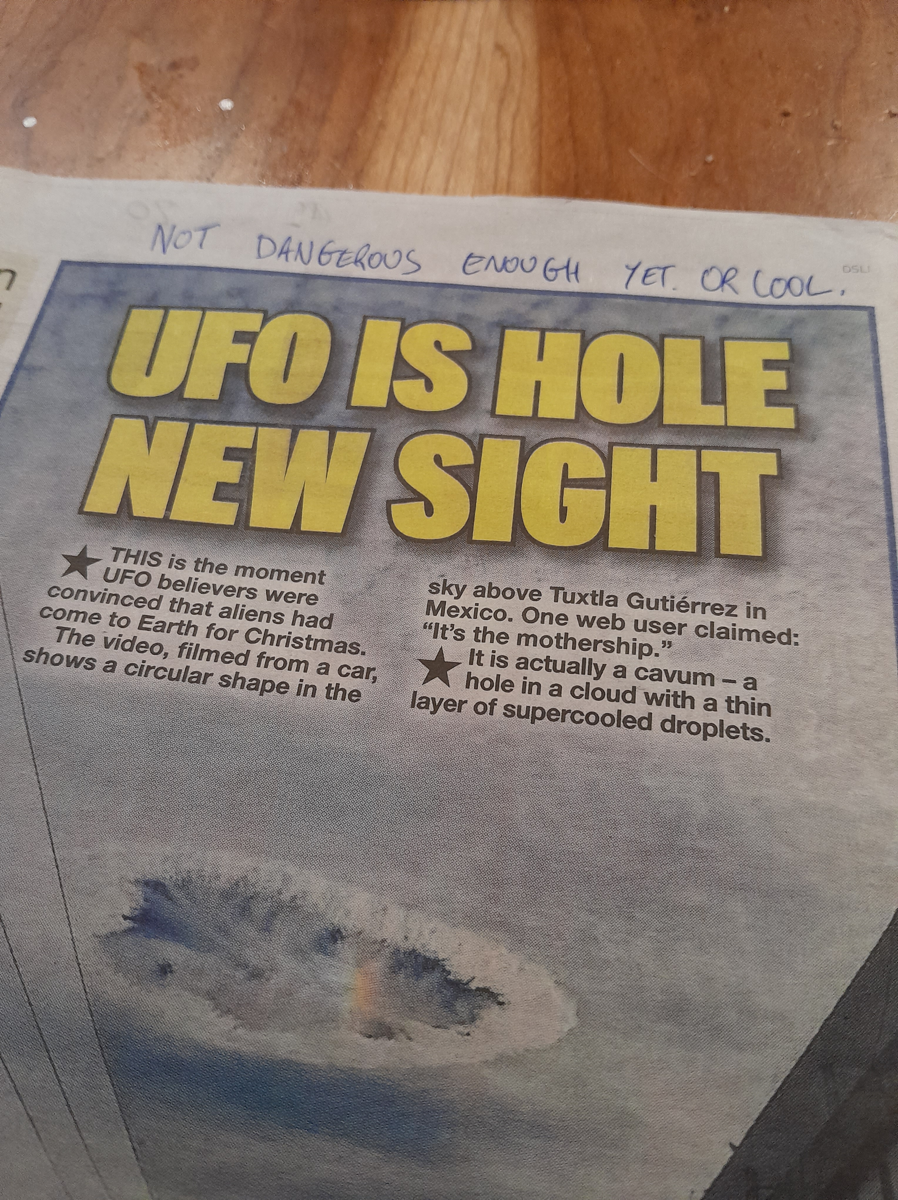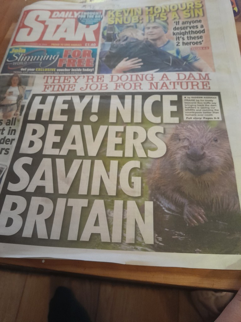 Posted: January 1, 2024 Filed under: Brief...therefore witty., Today's paper. | Tags: aliens, Beavers, climate change, Culture, Dangerous, fashion, Gardening, Humour, Magpies, media, News, Newspaper, Pubs, UFOs, Vegetables, World War 2, writing, WW2 Leave a commentI am sitting here, trying to remember what articles I read now. Thankfully it was the Daily Star, so there were lots of pictures.